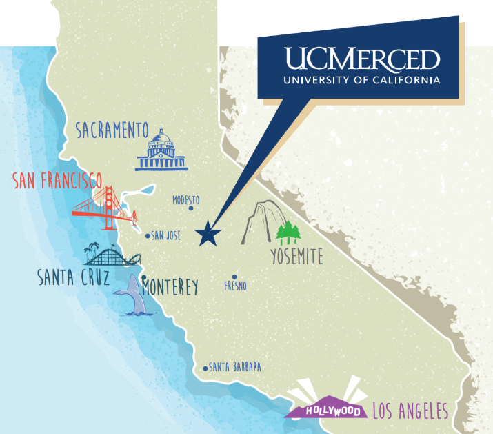 • 7000에이커(약 860만평) 규모의 UC Merced 캠퍼스는 Merced 시내에서 약 7마일 떨어진 곳에 위치해 있습니다.