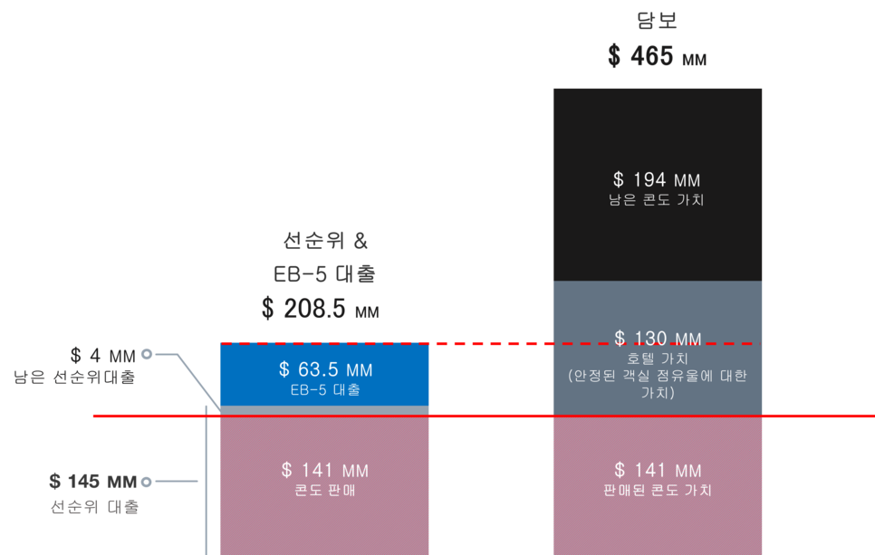 선순위 대출 및 EB5 대출금액 총액은 $208,500,000 로 담보가치는 부채금액의 2.23배인 $465,000,000 입니다.