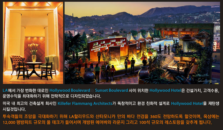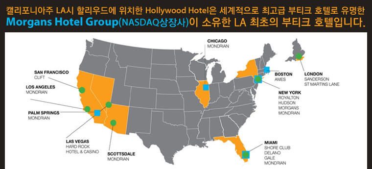 캘리포니아주 LA 헐리우드에 위치한 헐리우드 호텔은 세계적으로 최고급 부티크 호텔로 유명한 MORGANS HOTEL GROUP (NASDAQ 상장사)이 소유한 LA 최초의 부티크 호텔입니다.